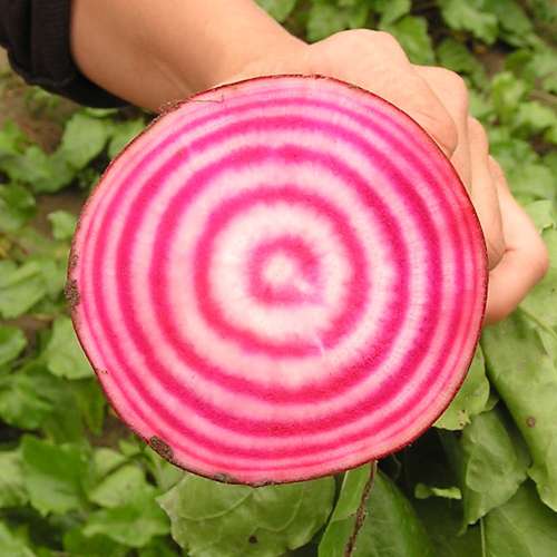 Cette betterave est très belle ! Elle possède chair bicolore, présentant des anneaux alternant le rose vif et le blanc. Elle est réputée pour sa douceur et son goût sucré, elle se consomme aussi bien crue que cuite. Enfin une betterave pour impressionner ses convives !