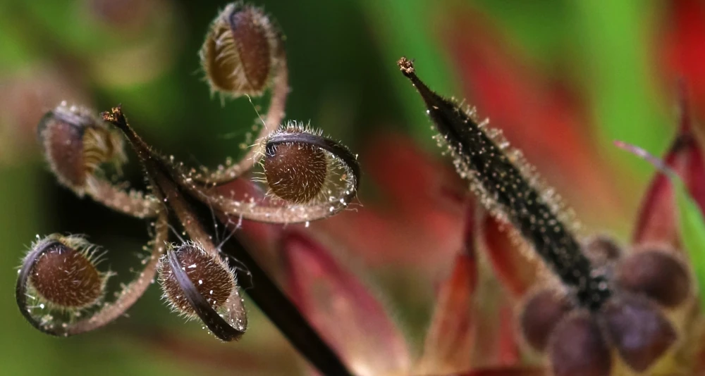 à maturité, les styles du Geranium dissectum s’enroulent brusquement sous l’effet de la chaleur, catapultant ses semences partout !