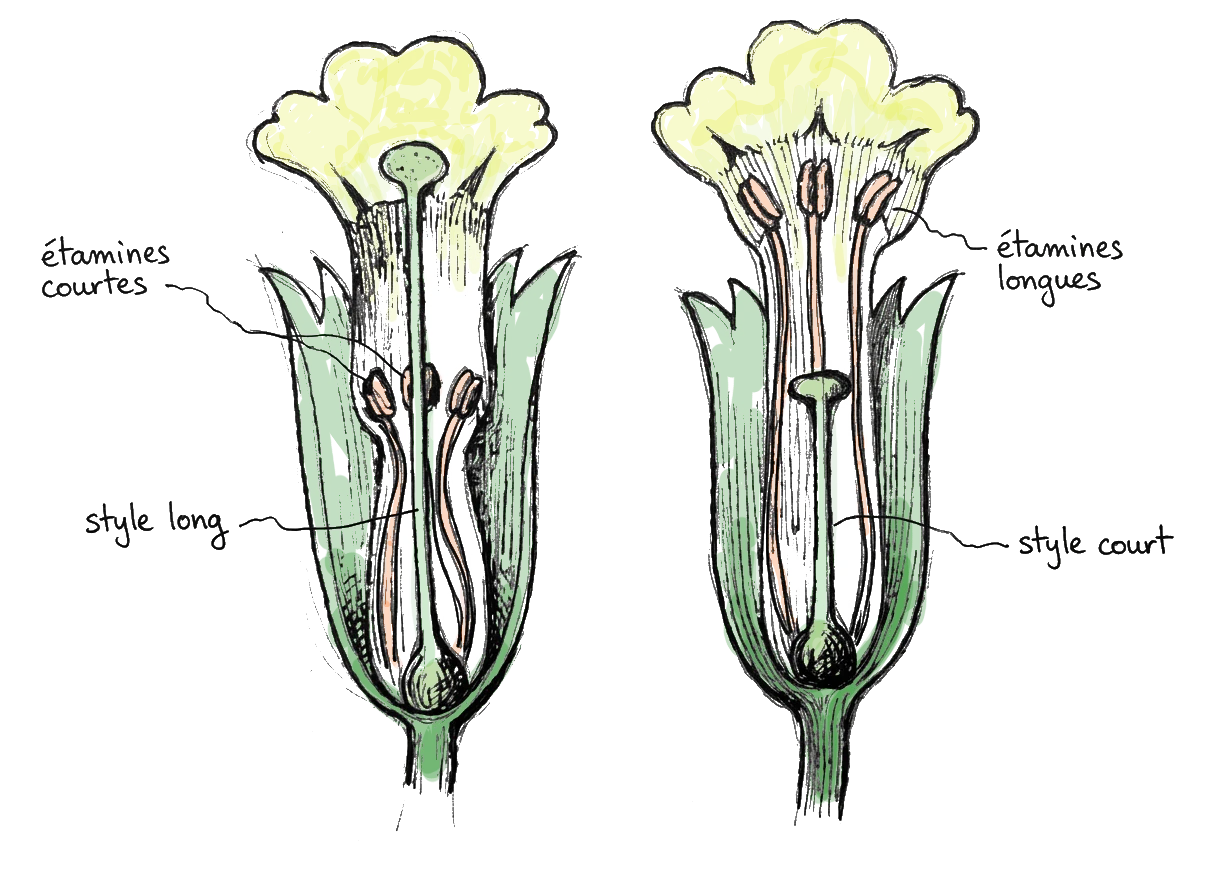 : la fleur « pin-eyed » (à long style) a les étamines? basses, tandis que la fleur « thrum-eyed » (à court style) a les étamines? hautes. Un pollinisateur visitant successivement ces deux types de fleurs transfère efficacement le pollen entre elles.