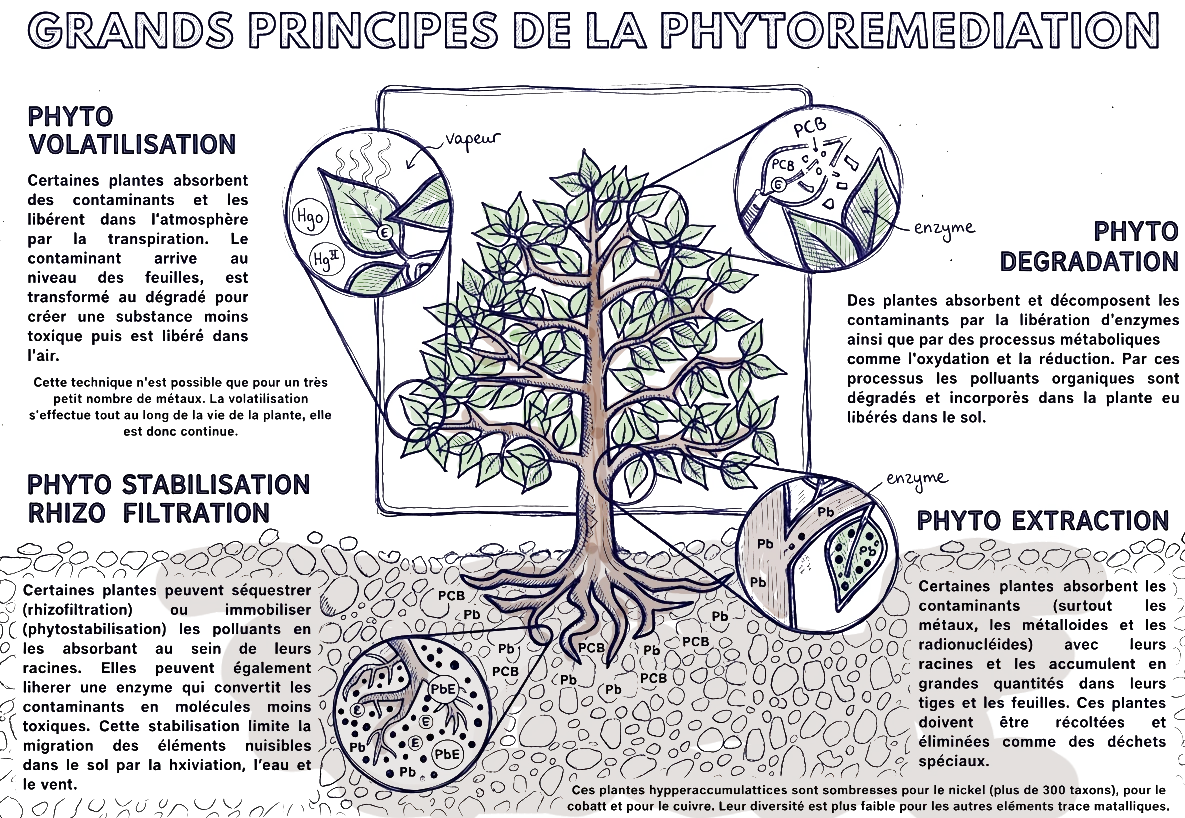Les principales formes de phytoremédiation? incluent la phytoextraction, où les plantes absorbent les polluants dans leurs racines et les accumulent dans leurs parties aériennes, permettant ensuite leur récolte et leur élimination. La phytostabilisation consiste à réduire la mobilité des polluants dans le sol pour éviter leur dispersion, notamment vers les nappes phréatiques. La phytodégradation repose sur la décomposition des polluants organiques grâce à l’action combinée des plantes et des micro-organismes présents dans leur rhizosphère?. La rhizofiltration, quant à elle, utilise les racines pour filtrer les polluants présents dans l’eau, tandis que la phytovolatilisation transforme certains polluants en composés gazeux relâchés dans l’atmosphère.