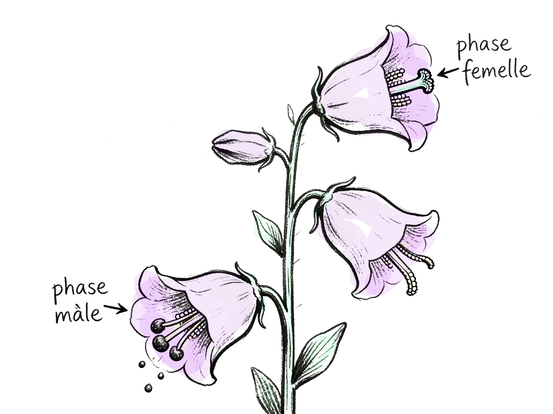 Dans le contexte des fleurs, on parle d’hétérochronie? florale : c’est quand les différentes parties reproductrices d’une fleur n’arrivent pas à maturité simultanément. Par exemple, dans la campanule à grandes fleurs, les étamines? (organes mâles) mûrissent et libèrent leur pollen plusieurs jours avant que le stigmate? (organe femelle) soit prêt à le recevoir. Ce décalage temporel empêche la fleur de se féconder elle-même.