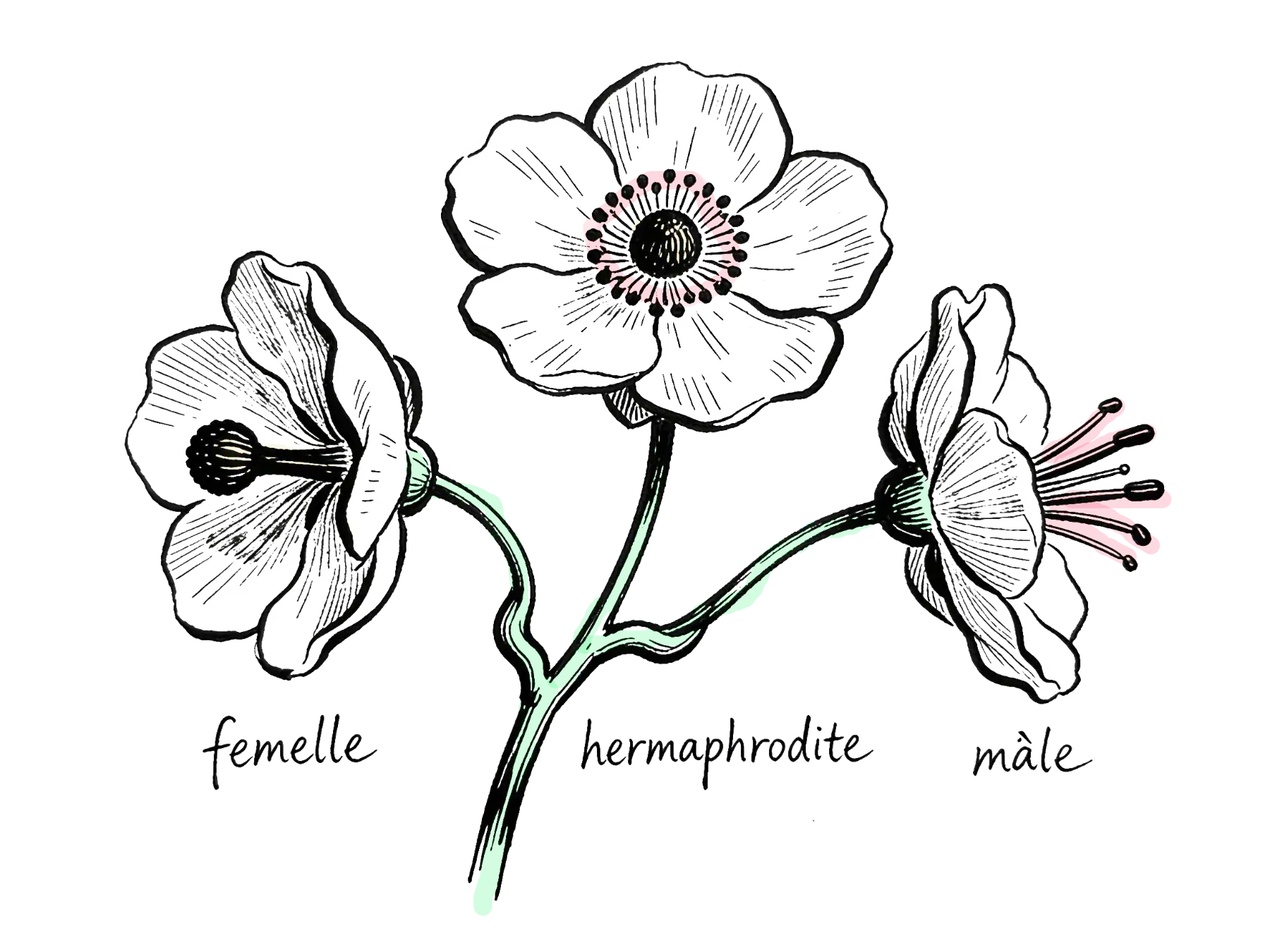 Fleur hermaphrodite? (du grec hermaphroditos, combinant Hermès et Aphrodite) : Fleur possédant dans une même structure florale les deux types d’organes reproducteurs : l’androcée? (ensemble des étamines? productrices de pollen) et le gynécée? (ensemble des carpelles? formant le pistil?). Cette configuration permet théoriquement l’autofécondation?, bien que de nombreux mécanismes (dichogamie?, auto-incompatibilité) favorisent la pollinisation croisée.