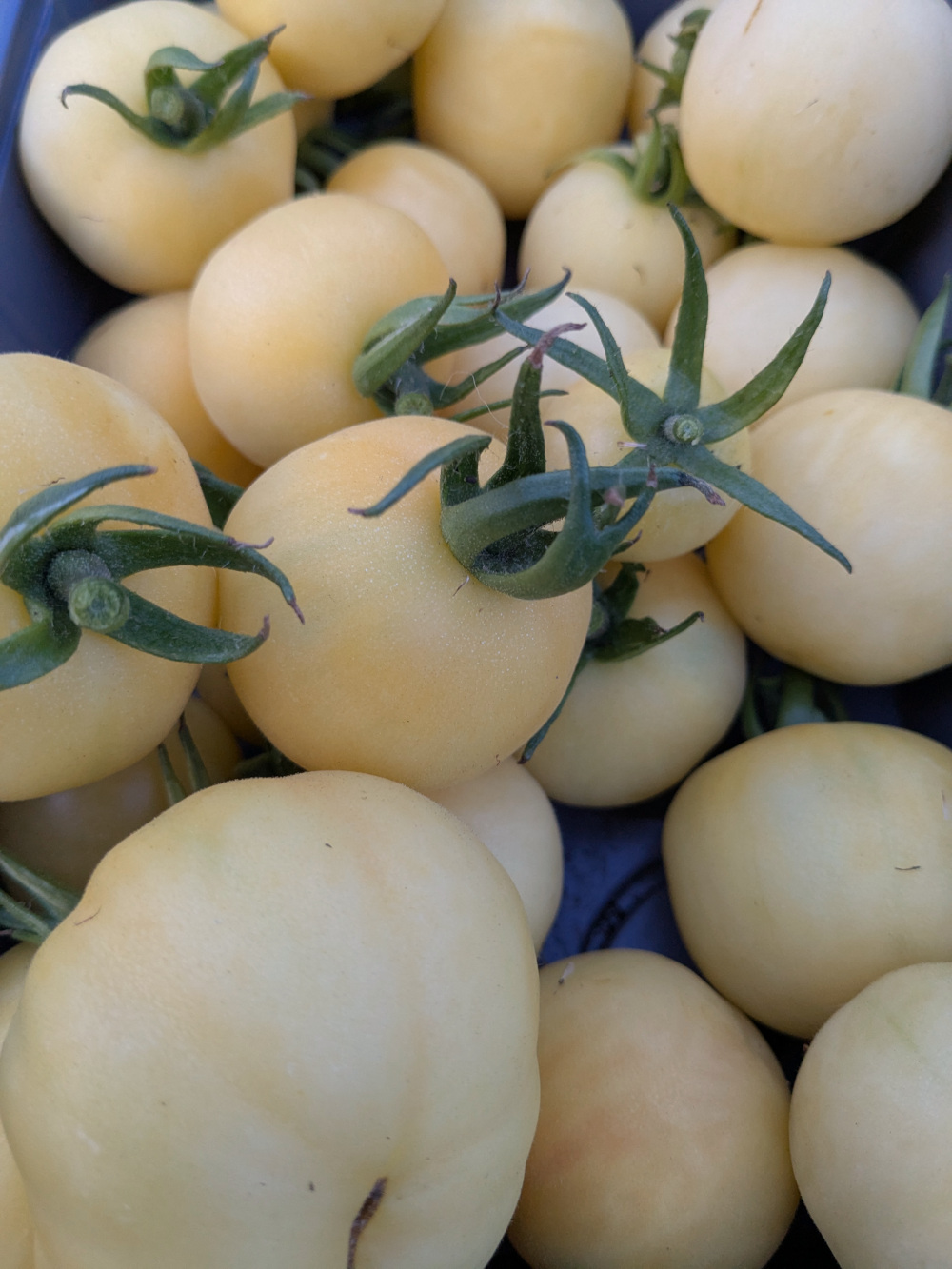 La peau est fine, duveteuse, rappelant celle des pêches. La chair est juteuse, de couleur blanche à crème. La saveur est sucrée avec une légère pointe d’acidité. Crue cette tomate n’est clairement pas une tomate de bouche !