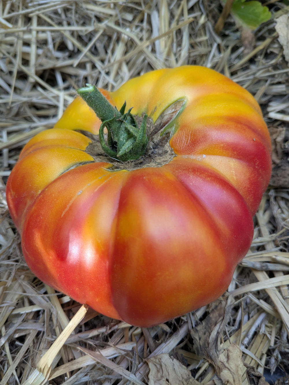 La Tomate Yellow Paw Paw est une belle découverte, c’est certainement la variété la plus appréciée au niveau du goût dans les jardins de Pensez Sauvage en 2025. Elle est bien charnue et juteuse, son goût est un savant mélange de sucré et d’acidité. Elle a une production raisonnable (entre 5 et 10 gros fruits par pied en extérieur). Ils n’ont pas tous réussi à mûrir en fin de saison. La plante est costaude et assez grande. Sa couleur est vraiment remarquable, surtout à l’intérieur du fruit.
